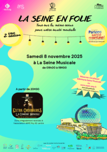 Seine en folie investit la Saine Musicale à Boulogne-Billancourt ! Une journée gratuite et ouverte à tous, pour parler santé mentale autrement : spectacles, tables-rondes, rencontres et initiatives inspirantes réunissent personnes concernées, aidants, soignants et citoyens.