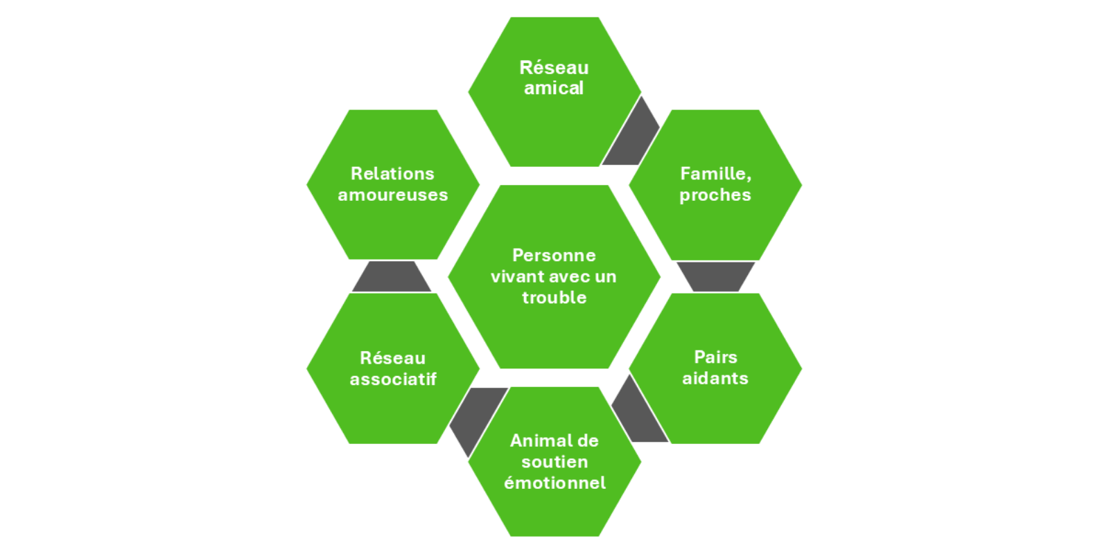 L’isolement est un écueil sur le chemin d’un rétablissement durable. Il est important de pouvoir au quotidien développer et maintenir un réseau de contacts qui constitue à la fois un lien social et un soutien. Au-delà du suivi médical et psychosocial, de nombreuses solutions existantes sont des ressources possibles. Aucune n’exclut l’autre et toutes peuvent contribuer à construire un quotidien autonome ainsi qu’une vie sociale et affective épanouissante.